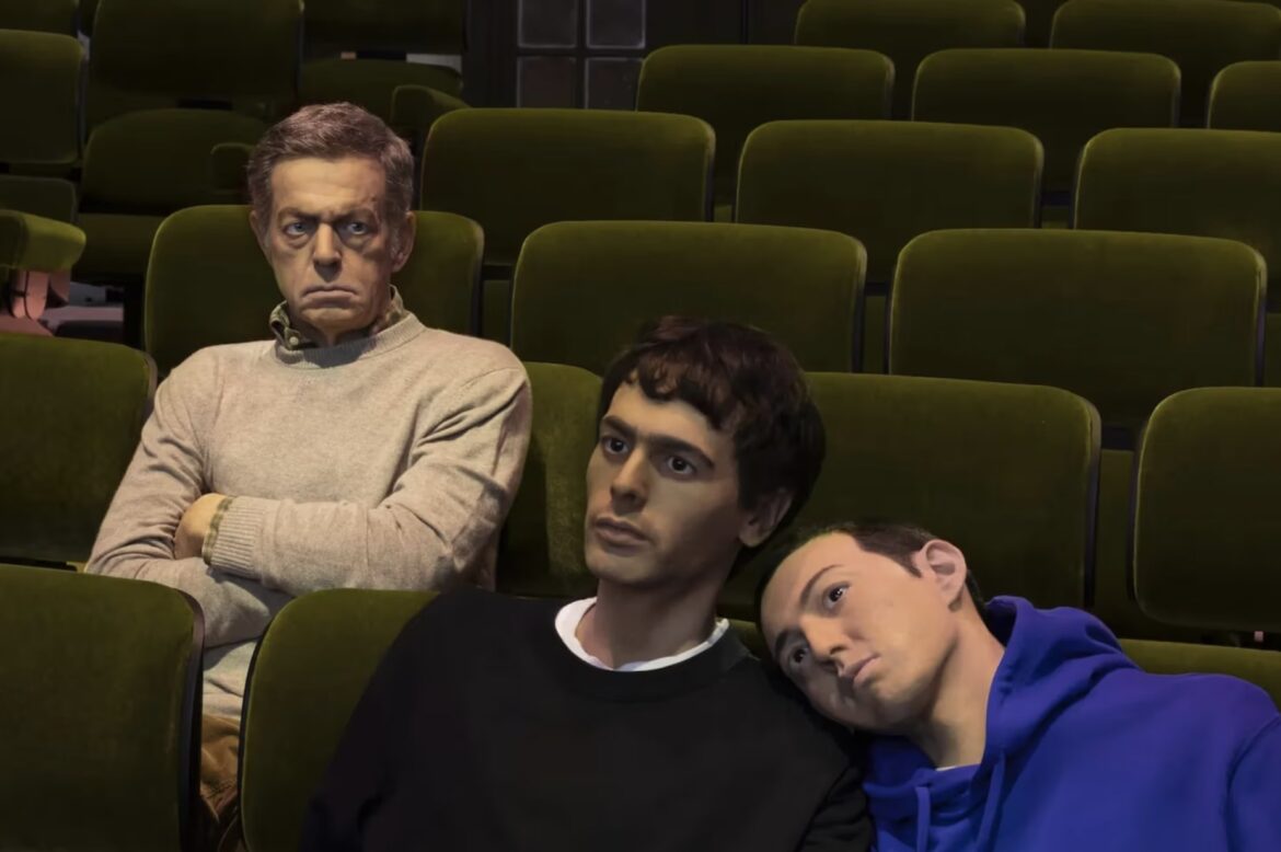 Installed inside King’s Cross Town Hall, the project masquerades as a cinema. A faintly surreal film plays on a looping screen, but the real story unfolds in the room itself: five hyperreal sculptures of spectators occupy the seats, each frozen in a different emotional register—entranced, distracted, impatient, detached. One lounges in the mezzanine, eyes glazed over, lit only by her phone’s blue glow.