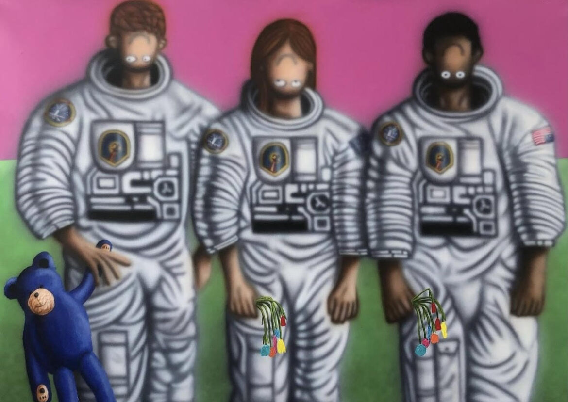 Through an ironic approach, the subject is about the confrontation of the characters Larry and Gina with unpleasant events that characterize everyday life. Fears and worries such as relationship problems, rejection, loneliness and material hardships should have a lightness through which the viewer can reflect on them without falling into negative thoughts. By working with photos, the images always have a reference to the real world. The figures within the image are represented as some sort of dolls that only come alive trough theire eyes. With the airbrush a digital look is created which is broken up by oil elements and different materials.