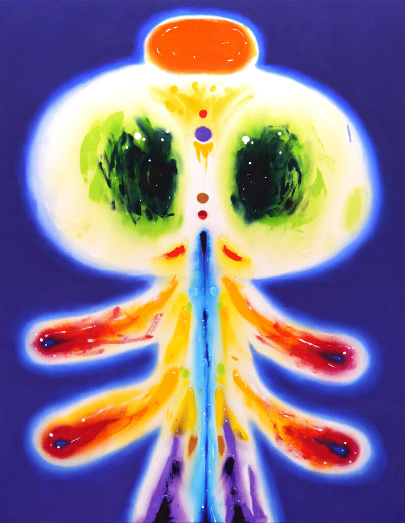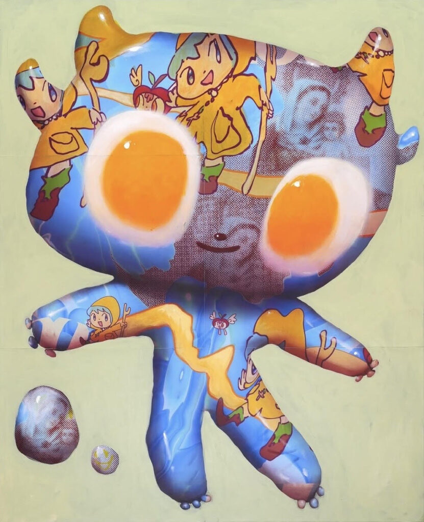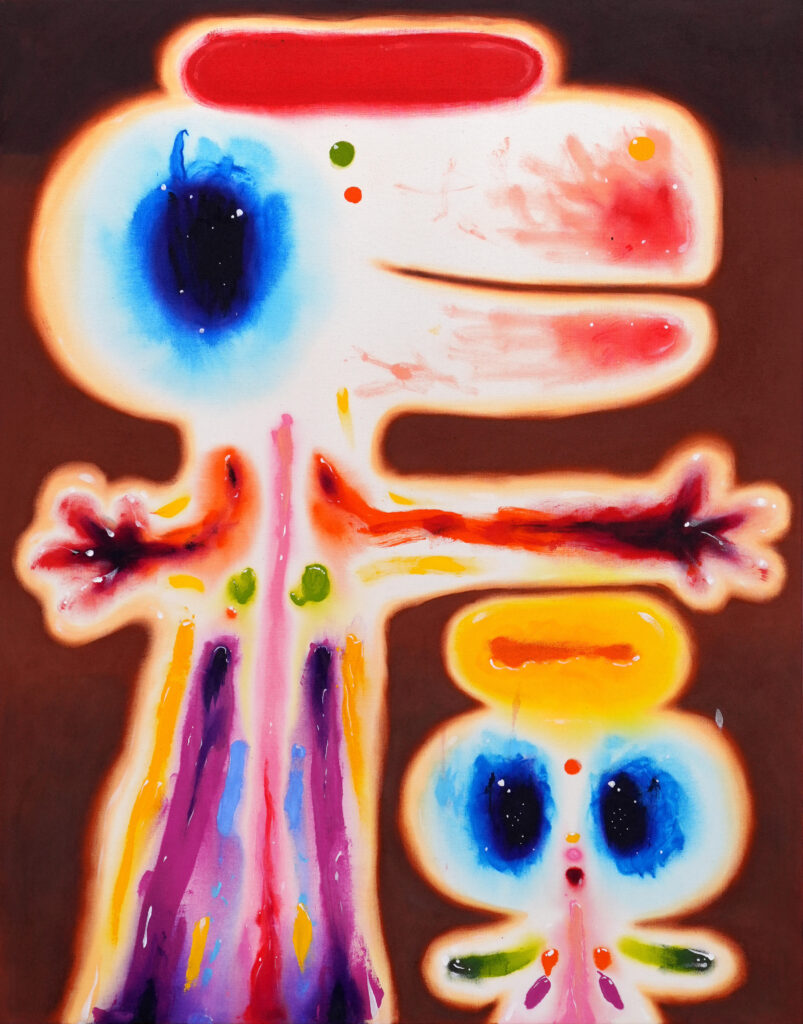 Drawing on her background in animation, Useche blends pop-inflected aesthetics with deeply personal narratives, referencing Japanese Superflat, pre-Columbian Colombian art, Catholic symbolism, and internet culture. Working primarily in acrylic on canvas, she embraces a raw, playful visual language that contrasts instinctive mark-making with moments of precision. Her avatar-like figures function as fragmented extensions of the self, allowing questions of gender, sexuality, cultural identity, and nostalgia to unfold through exaggeration, ambiguity, and humor.