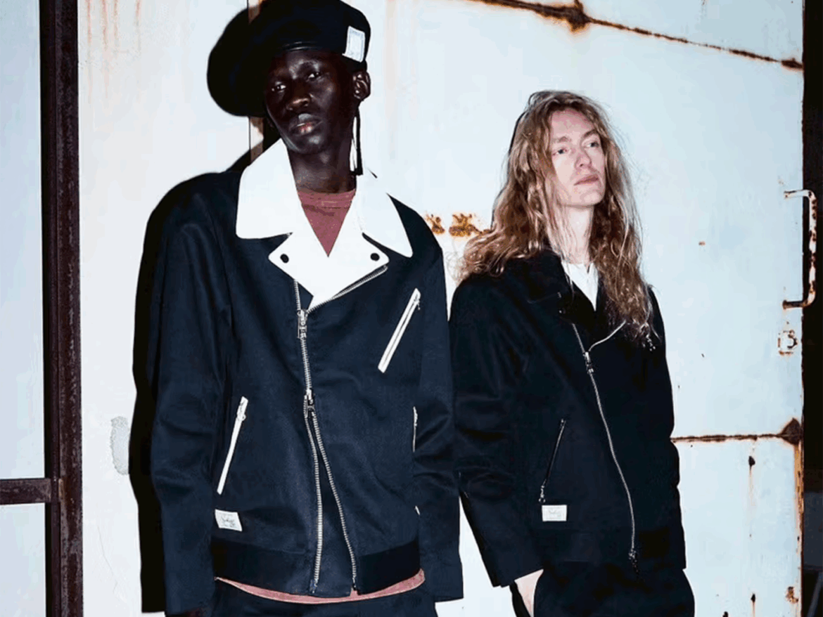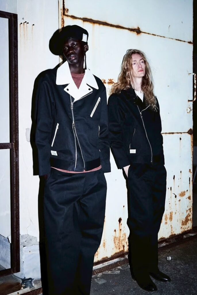 At the centre of the collection is a reworked Double Riders jacket, one of Schott’s most recognisable silhouettes. The design leans into subtle detailing rather than overt styling — embroidered accents, contrasting collars, and utilitarian pocket placements that quietly reference both brands’ histories. It’s a jacket that feels lived-in from the start, designed to be worn rather than preserved.