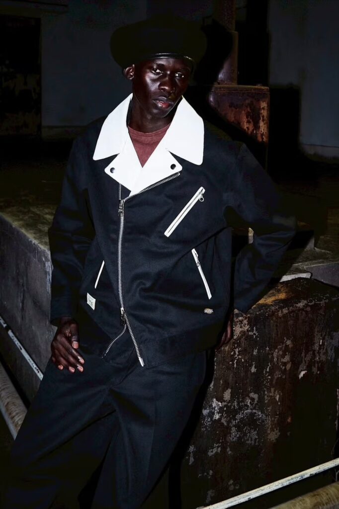 Alongside it are the TC Work Pants, rooted in the proportions and durability of Dickies’ iconic 874 trousers. The cut remains familiar, but small adjustments bring the pants closer to the capsule’s biker sensibility, balancing movement and structure without losing their workwear backbone.