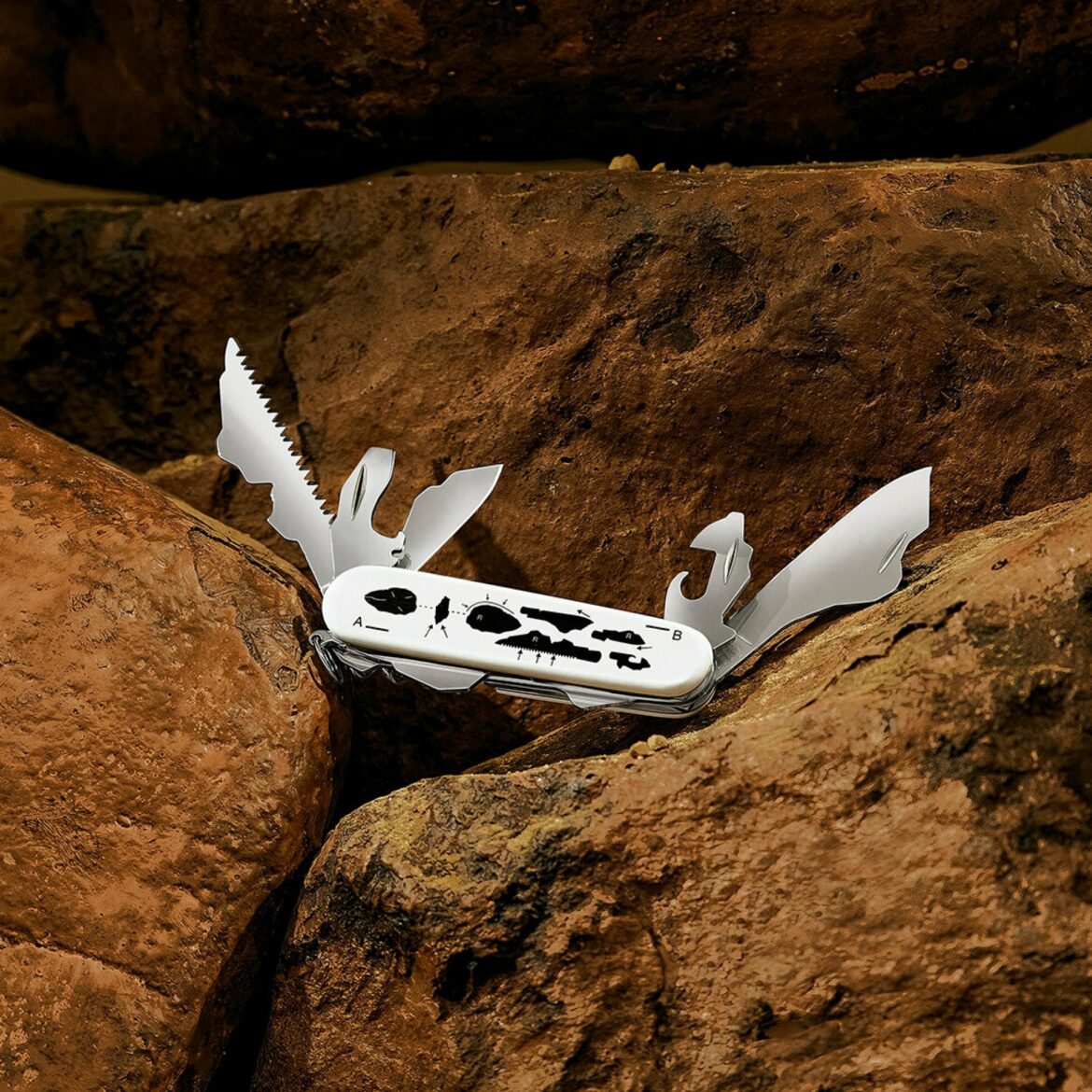 The white knife has been decorated with Off-White graphics that represent prehistoric tools from the stone age, and something that is particularly unique about this particular knife is that the different blades are cut in significantly different shapes than on a regular Victorinox knife . The surface of the knife is made of the natural resin-mineral composite Corian, which feels like stone to the touch – and is resistant to scratches and wear.
