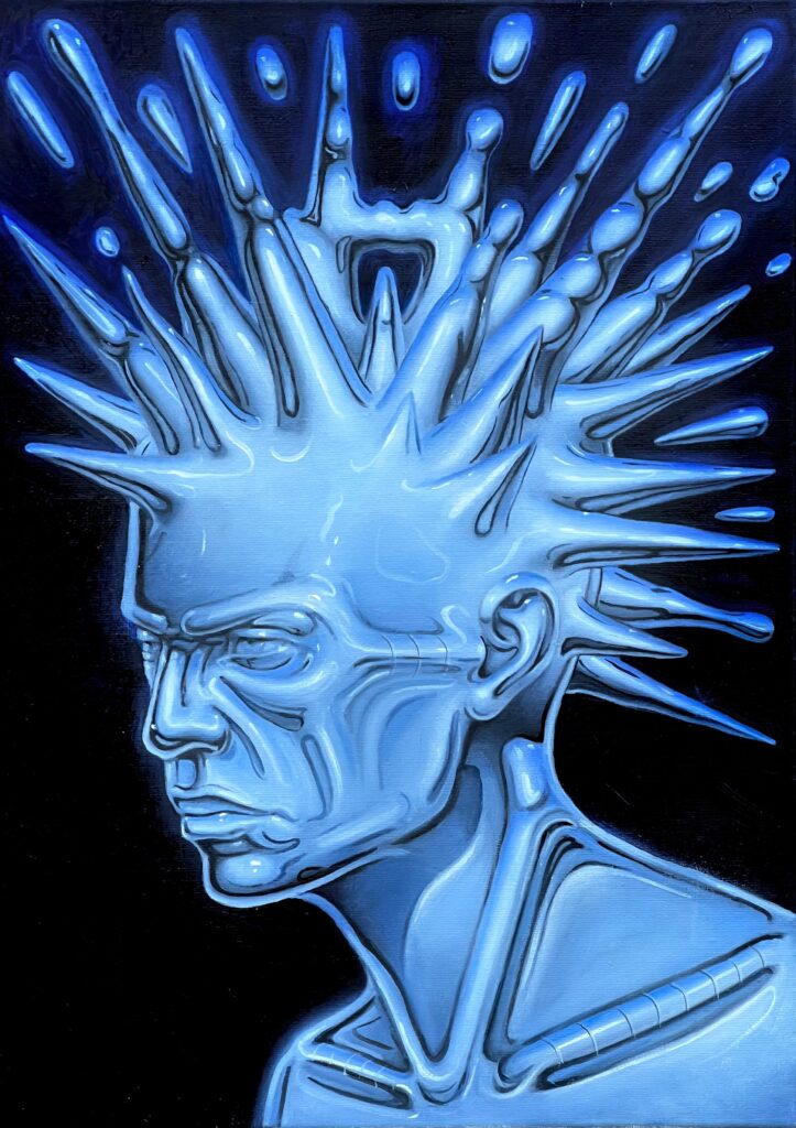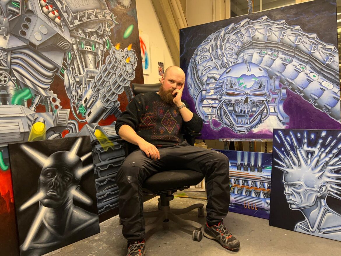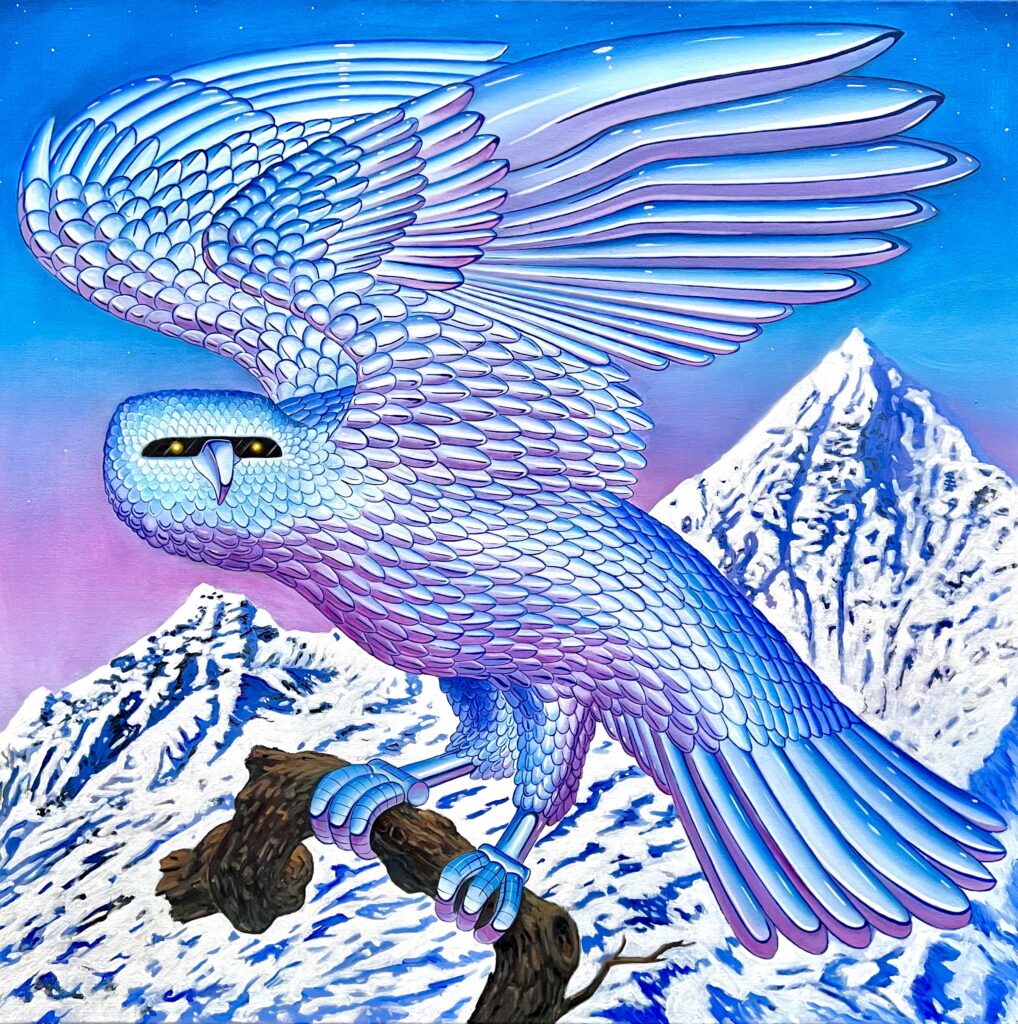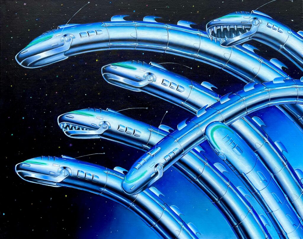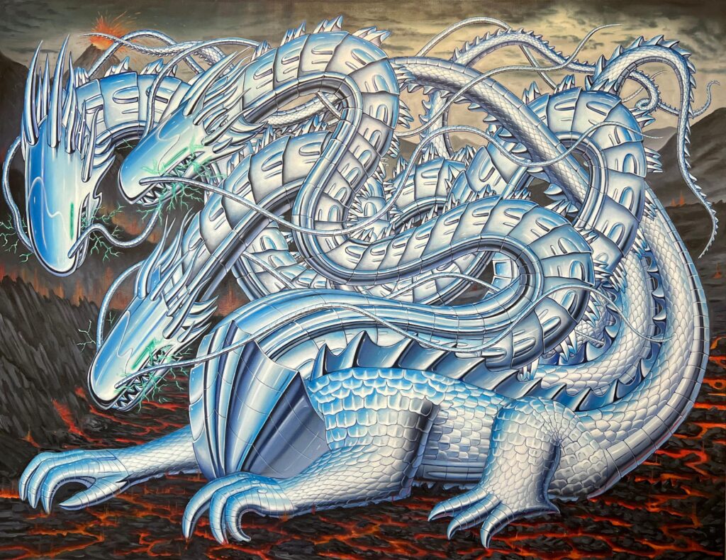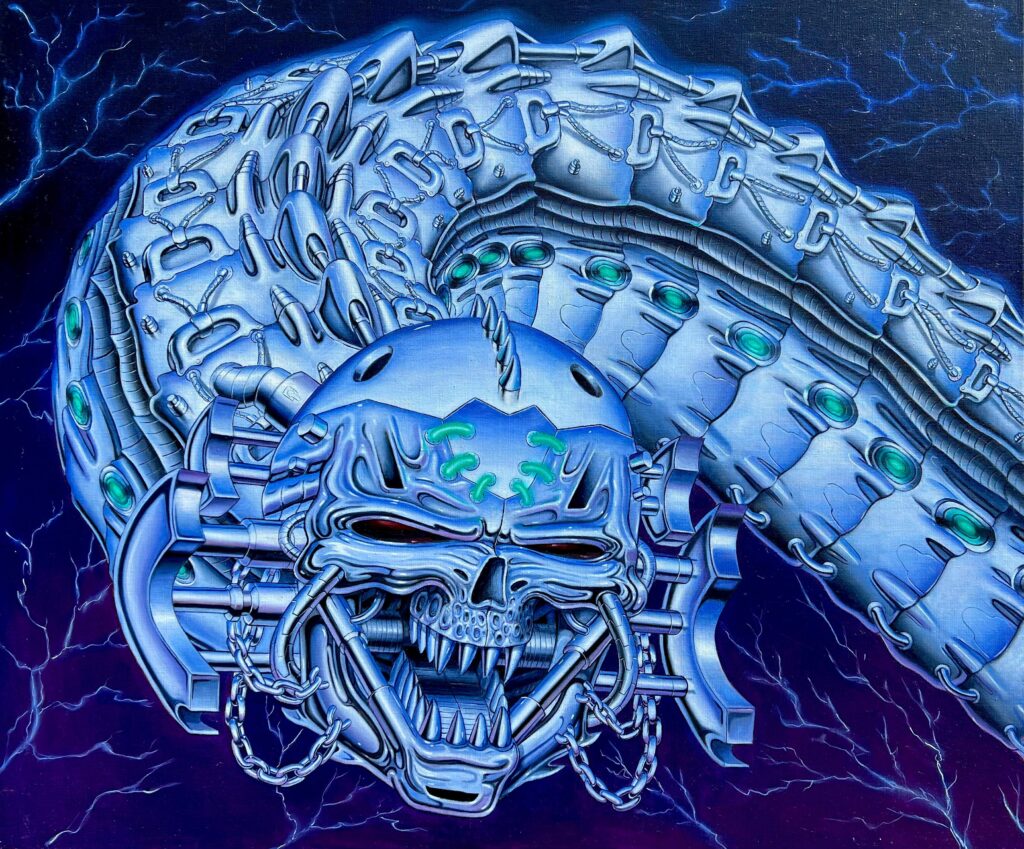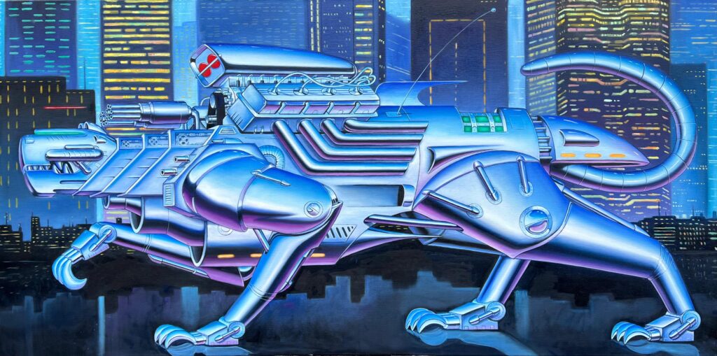 Vincent Langaard doesn’t just paint. He engineers entire mythologies, half-tech, half-fable, all feral energy. With “Liquid Metal,” his first solo at Shug Gallery, he throws us into a hyper-slick realm where beasts are chrome and cities hum like circuits. We caught up with him to talk machine-spirit hybrids, art as rebellion, and how sci-fi isn’t fiction anymore.