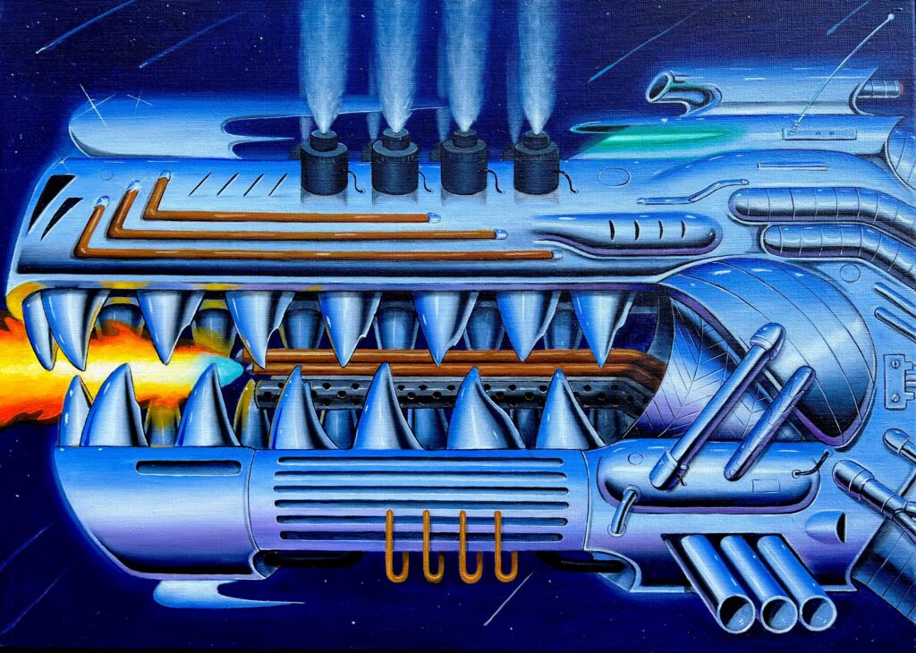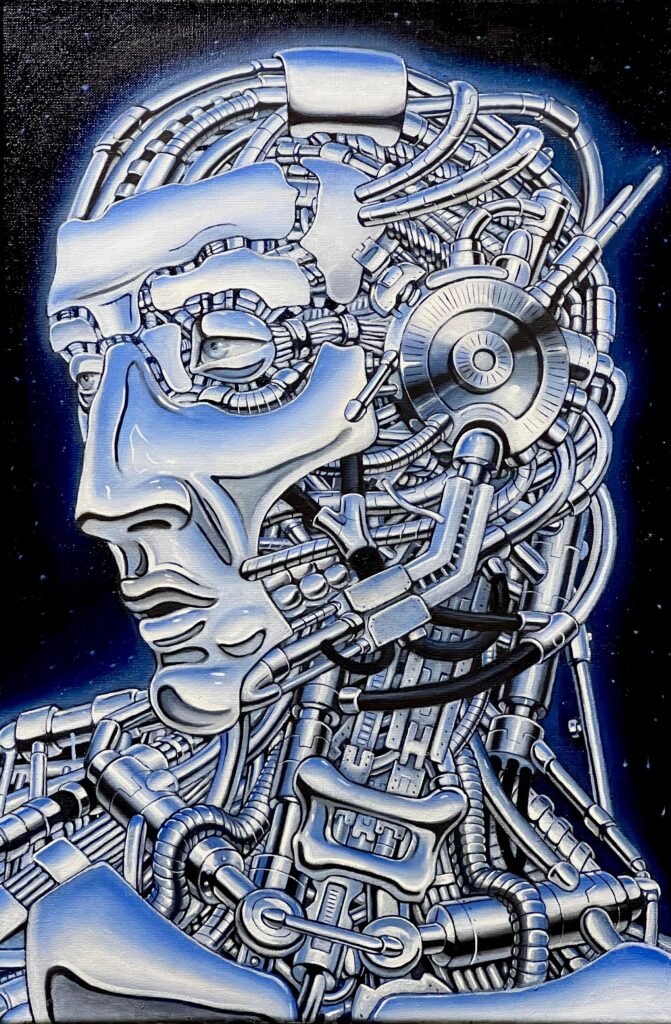 Vincent: Most of my paintings are oil on linen. I usually start with a very small sketch, about 10×10 cm, pencil on paper. Then I make one or two more sketches on paper. Sometimes I even make a rough sculpture with air drying clay to get a better feel for the robots 3-dimensionality. I draw the final sketch on iPad to get clean lines, test colour combinations and composition. When the sketch is ready I transfer to canvas using a grid system. Things that work on an iPad doesn’t necessarily work visually on a big canvas so I use the transfer very loosely and I actually make a lot of calibrations and changes as I paint on the canvas.
