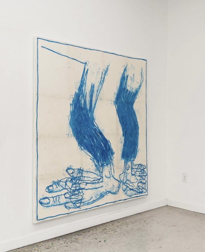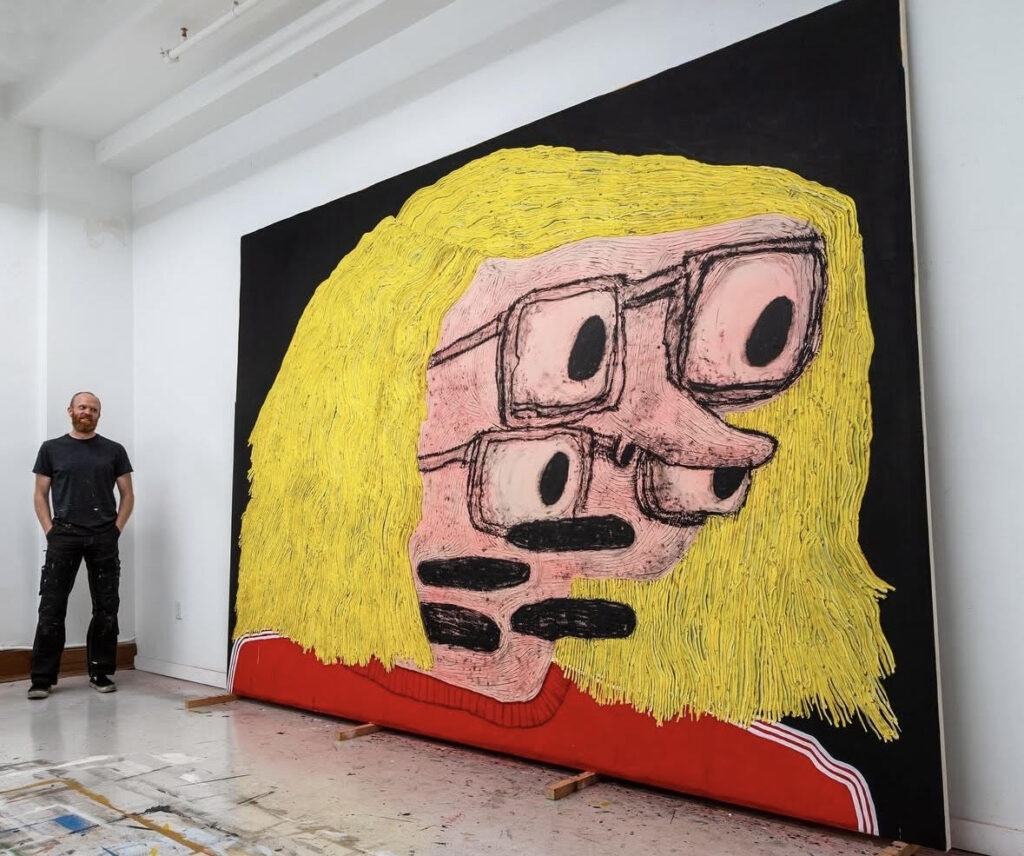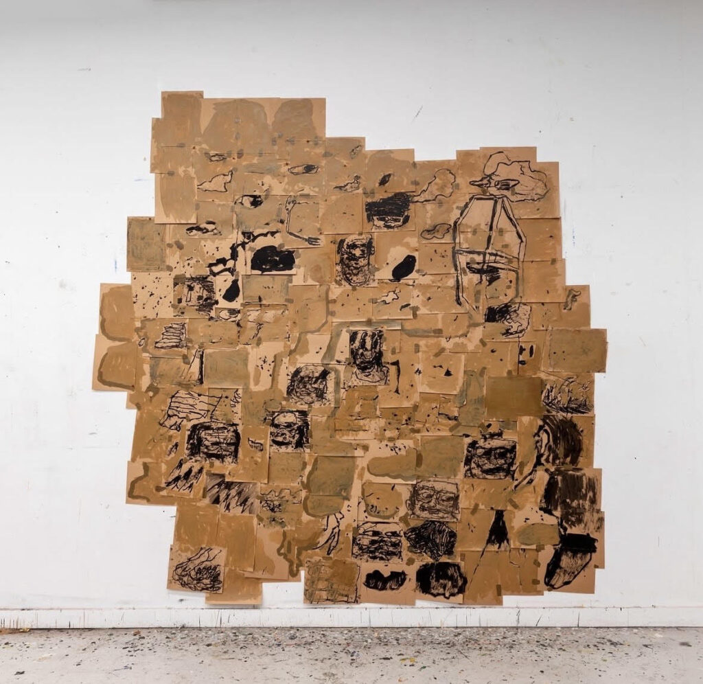 Taylor Anton White’s paintings operate somewhere between construction and collapse. Pulling together fragments of everyday life — cars, suburban traces, scraps of text — his works are built through layers of paint, industrial materials, and improvised structures. The surfaces feel worked, disrupted, and constantly in motion.