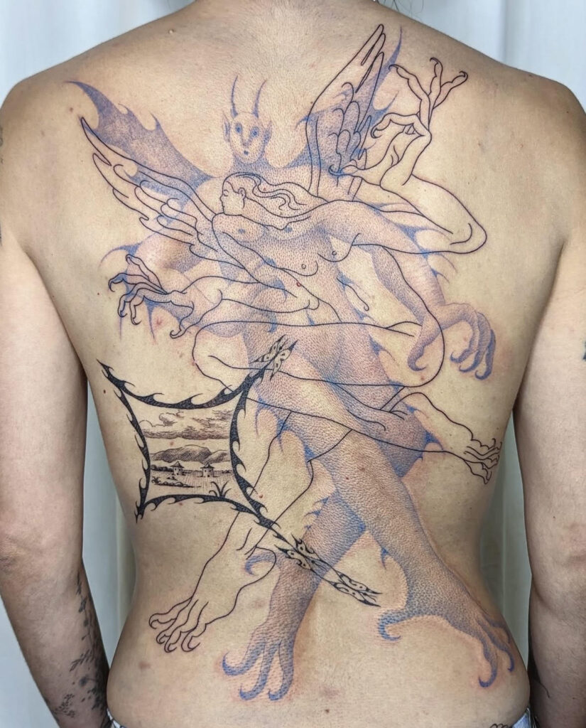 Fuzi, whom you interviewed, was one of the first to do that in France. He didn’t follow the established standards of what a “good” tattoo was supposed to look like. That opened the door for the rest of us. I remember people saying seven or eight years ago, when they saw our tattoos, “I didn’t even know you could do that with tattooing.” It allowed many artists to make a living from their drawings, to leave jobs that didn’t suit them, and to regain a sense of autonomy. It’s specific, and on a small scale, but to me it’s a strong example of the kind of transformation that can happen when perspective shifts, even slightly.
