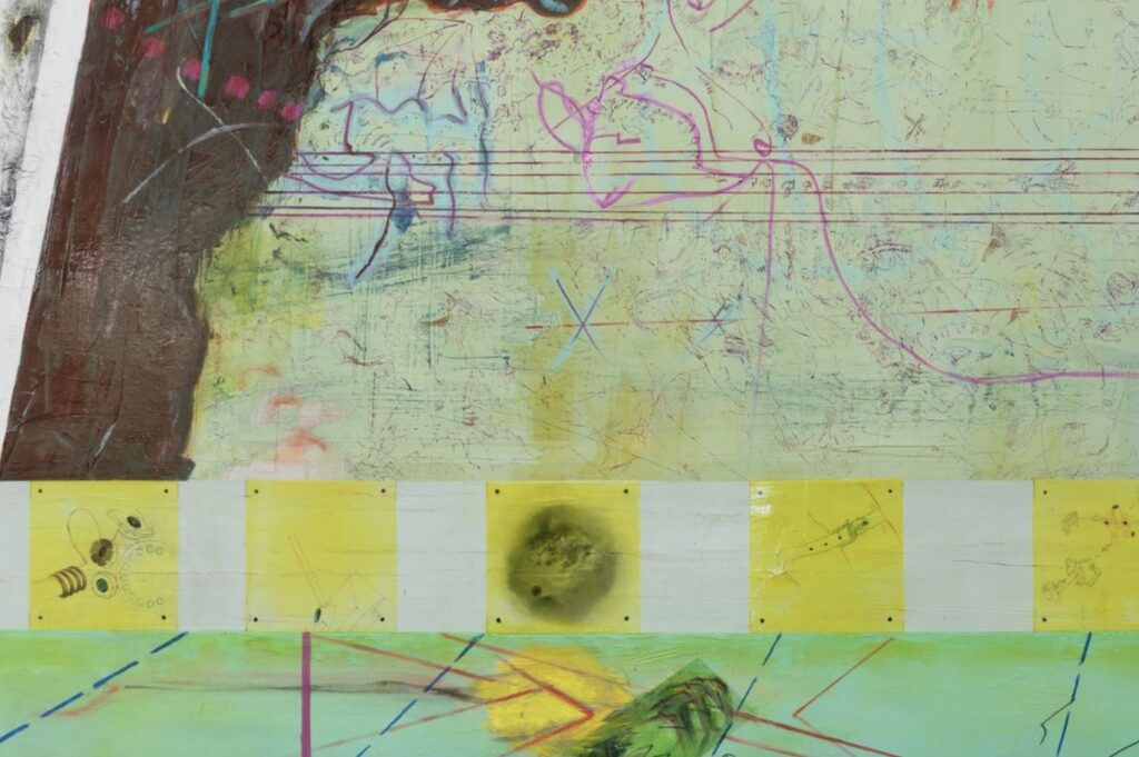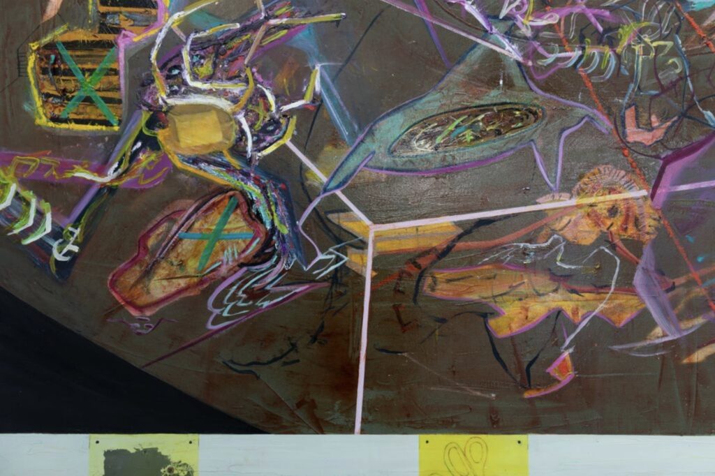 I suppose the paintings in the show follow the concept of ‘transitive painting’, which involves an effort to incorporate social networks via internal and external passage into painting as an object. In terms of internal passage, forces such as torque and peripheral impact are not merely depicted, but act as a driving force on my thinking and the way I apply paint. At a certain stage of the painting L-135, I attempted to measure the ‘angles’ between certain words or meanings associated with these forces. The impossibility of this task resulted in an accumulation rather than a narrative—like the mixer at the back of a concrete truck rotating endlessly or recalling Voyager 1 & 2’s ‘Golden Record’; however, not meant for extraterrestrial communication, instead functioning as an index of the painting’s internal logics.