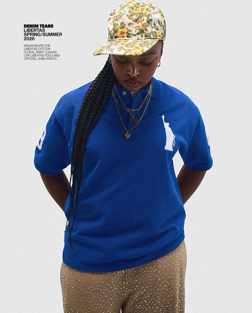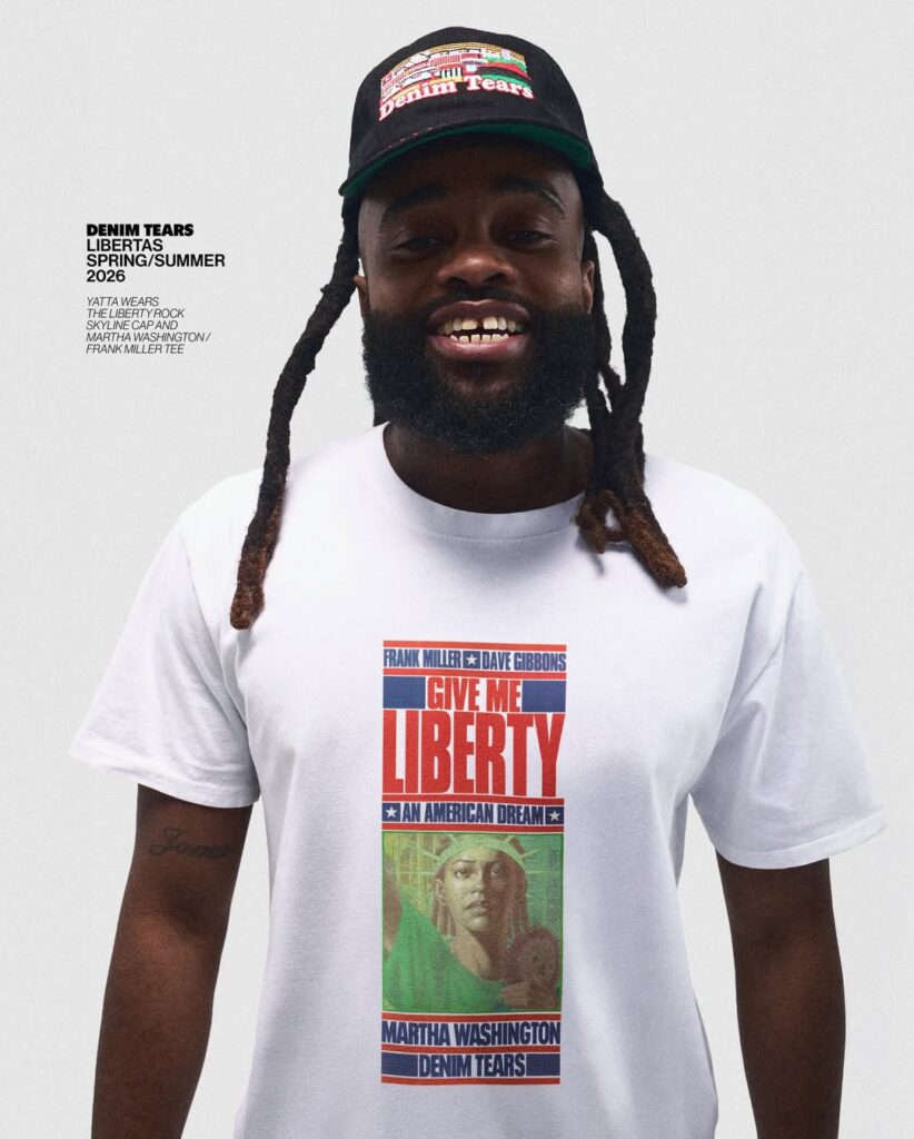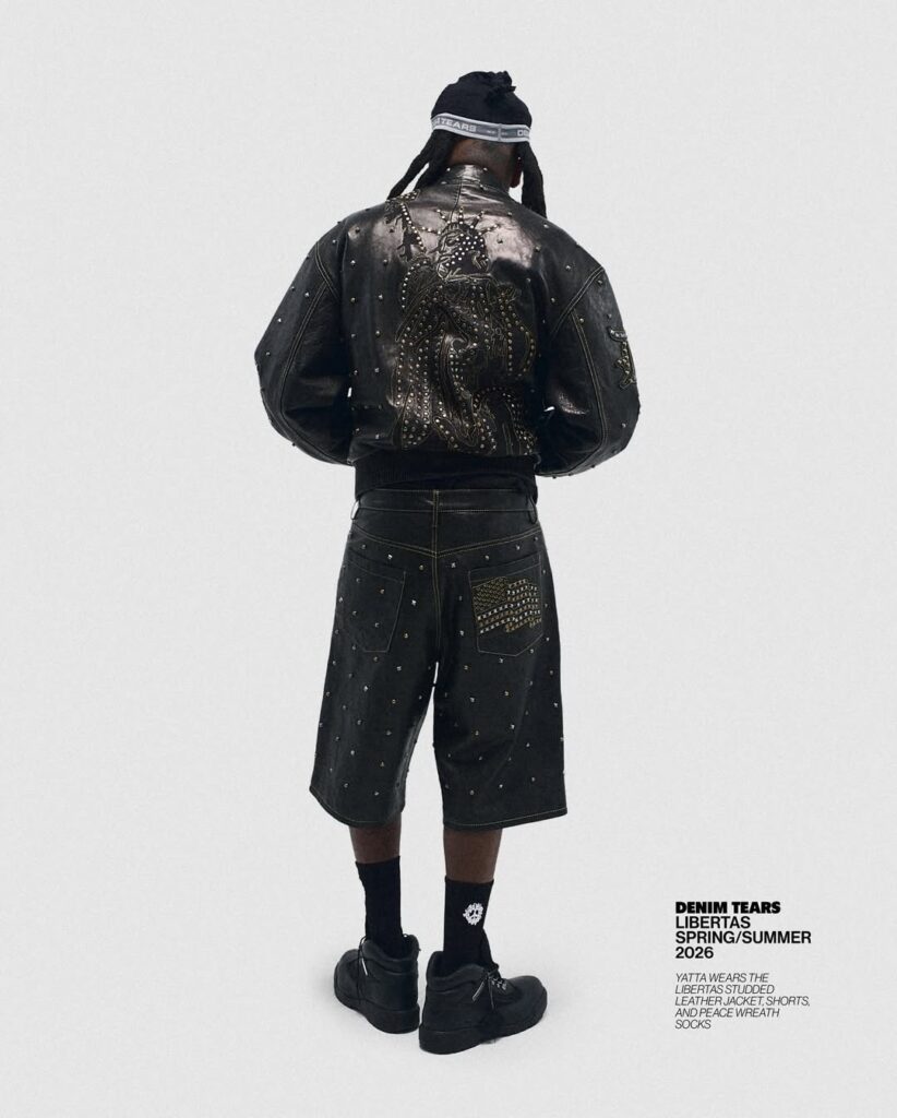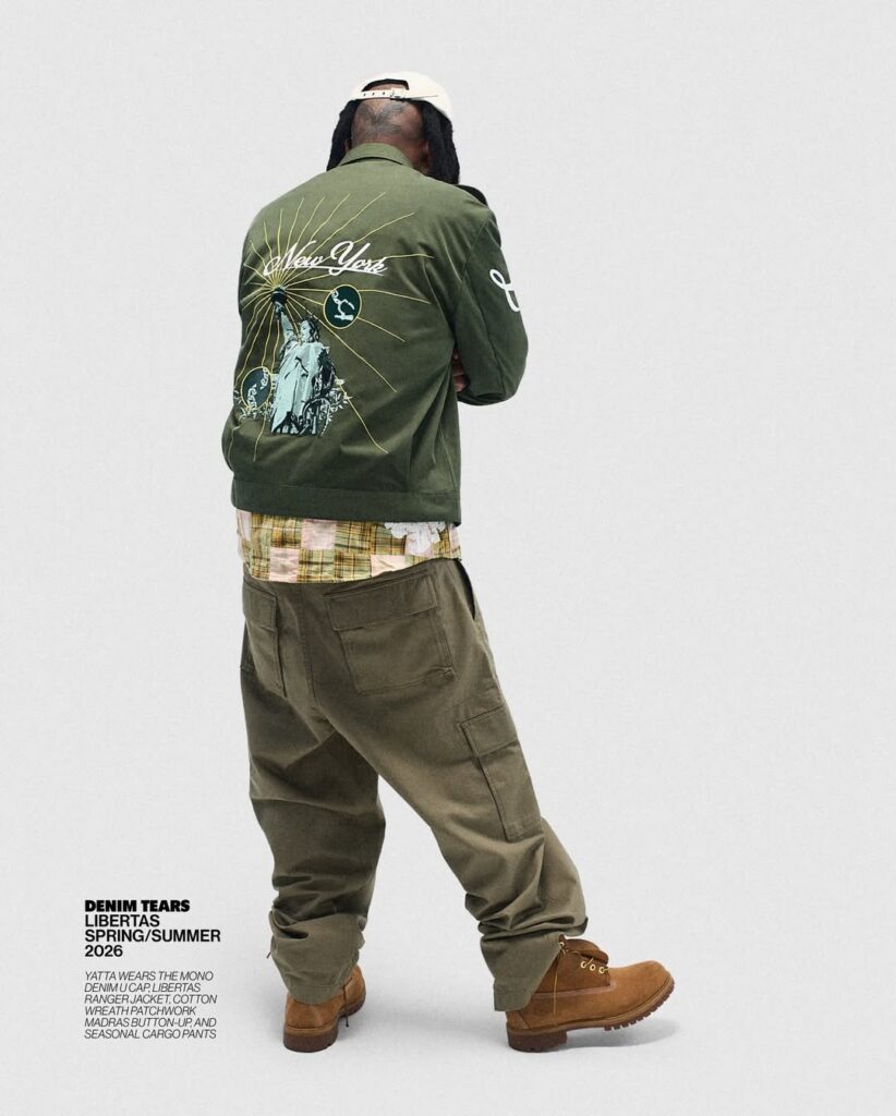 The article details how Emory, through his label Denim Tears, uses fashion not as surface decoration but as historical excavation. The collection re-centres a largely ignored detail of the statue: the shackles symbolising the abolition of slavery. While the torch has become shorthand for welcome and democracy, the chains — arguably the monument’s most radical feature — have faded from public consciousness. Emory’s work reframes that omission as symptomatic of a broader cultural amnesia surrounding America’s entanglement with slavery.