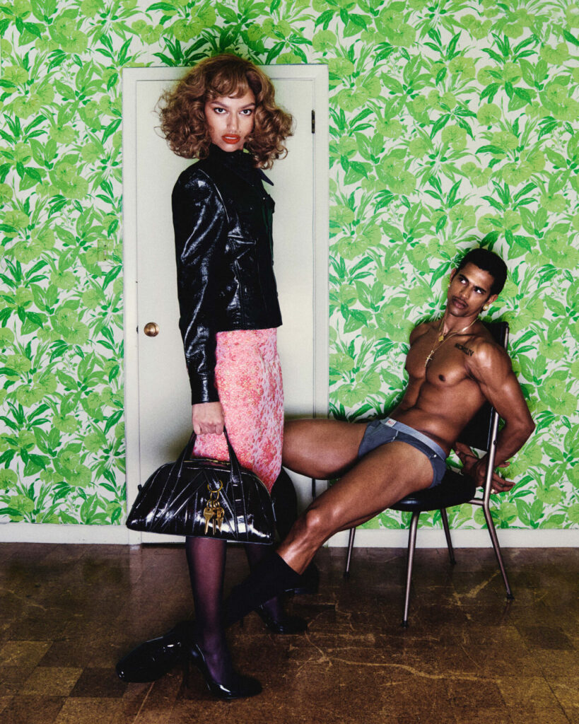 Visually, it plays out in retro interiors that feel almost psychologically charged: green carpets, impossible wallpapers, rooms that look suspended in time — spaces that don’t just frame the clothes but pressurise them. The set isn’t a backdrop; it’s a mood. The entire thing is shot and directed by Diego Bendezu, who treats the narrative like a slow-burning reveal: all tension, pauses, and carefully staged closeness.